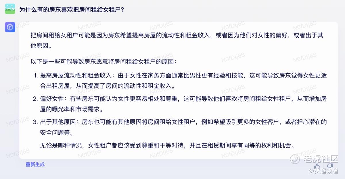 第二个问题:“为什么有的房东喜欢把房间租给女租户?”,文心一言的回答都在点子上了: