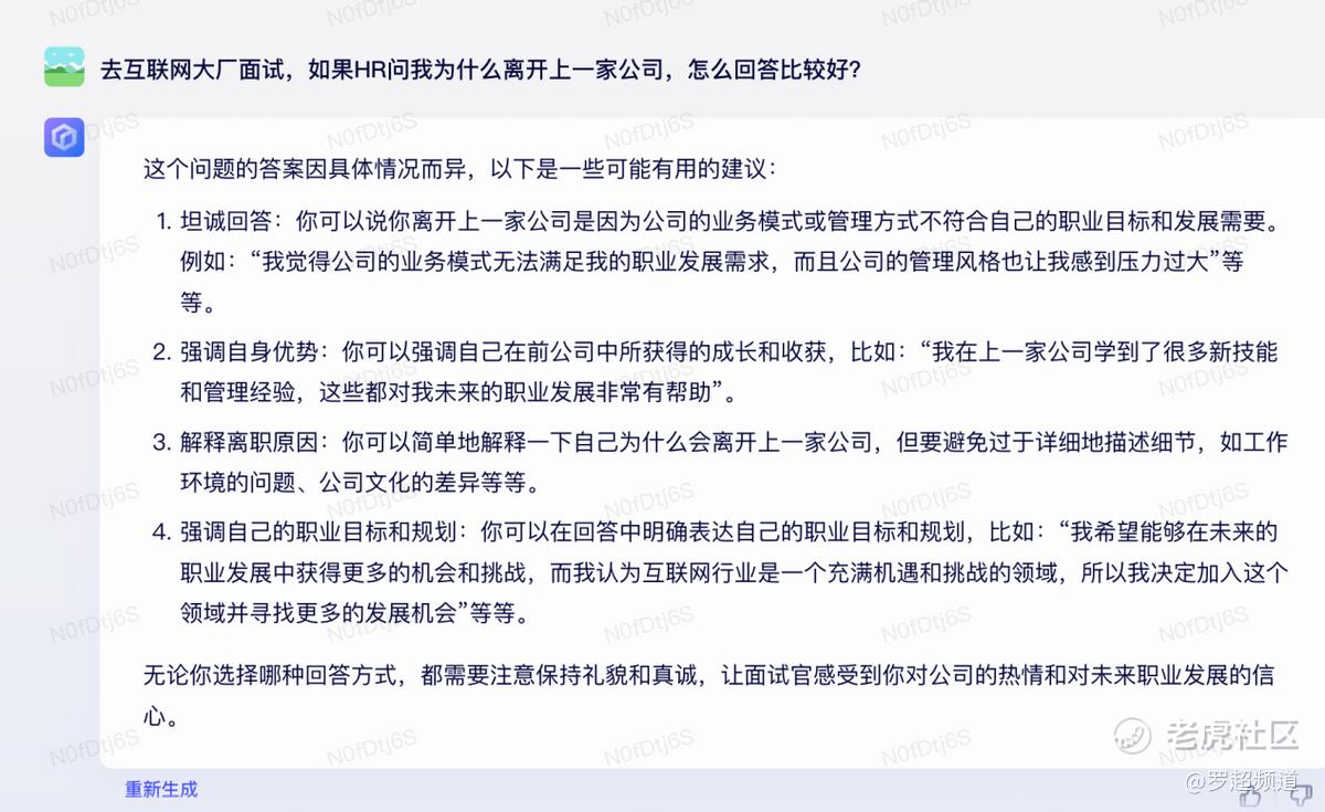 文心一言还有一个特别贴心的功能,就是“重新生成”,也就是说它理论上跟搜索引擎一样可以给用户多个不同“版本”的答案,直到用户满意为止,用户也可以对结果进行反馈比如点赞,这样的反馈会加速文心一言以及底层的大模型技术的进化。