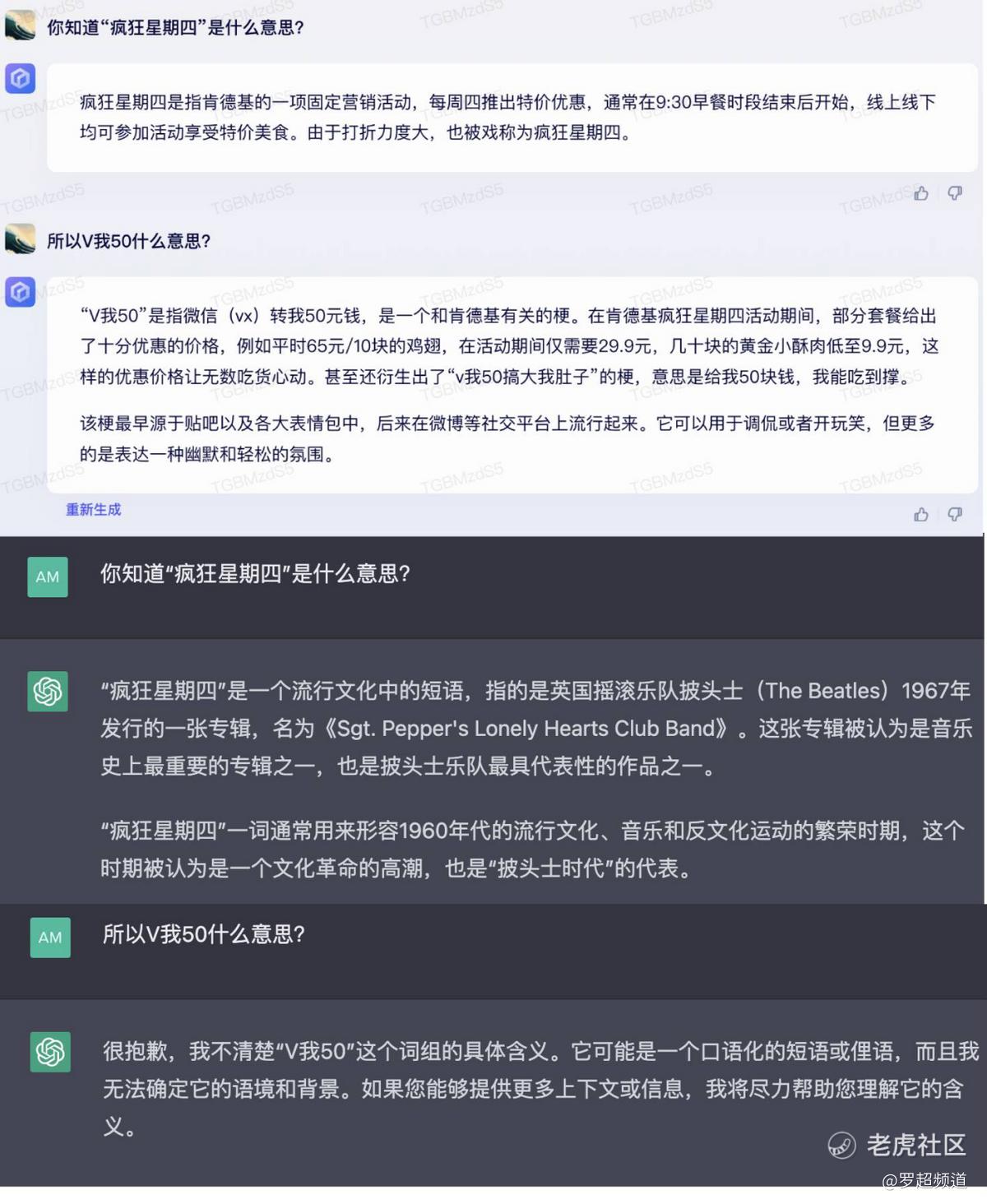 这是因为基于百度搜索业务的数据内容积累,它更有“时效性”更前卫一点。ChatGPT底层GPT-3“学习”的内容是过时的,肯德基V我50的梗,当时不够火。