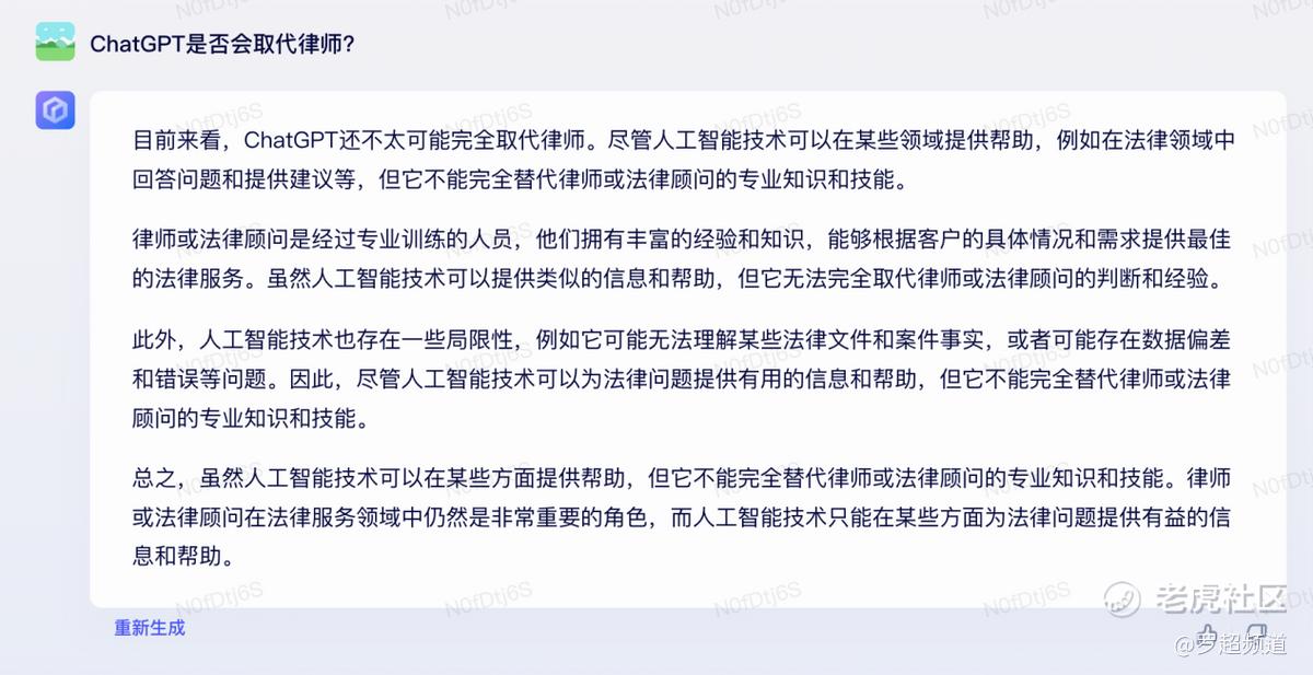我想试试看,这三个问题文心一言能不能回答?第一个问题:“ChatGPT是否会取代律师?”: