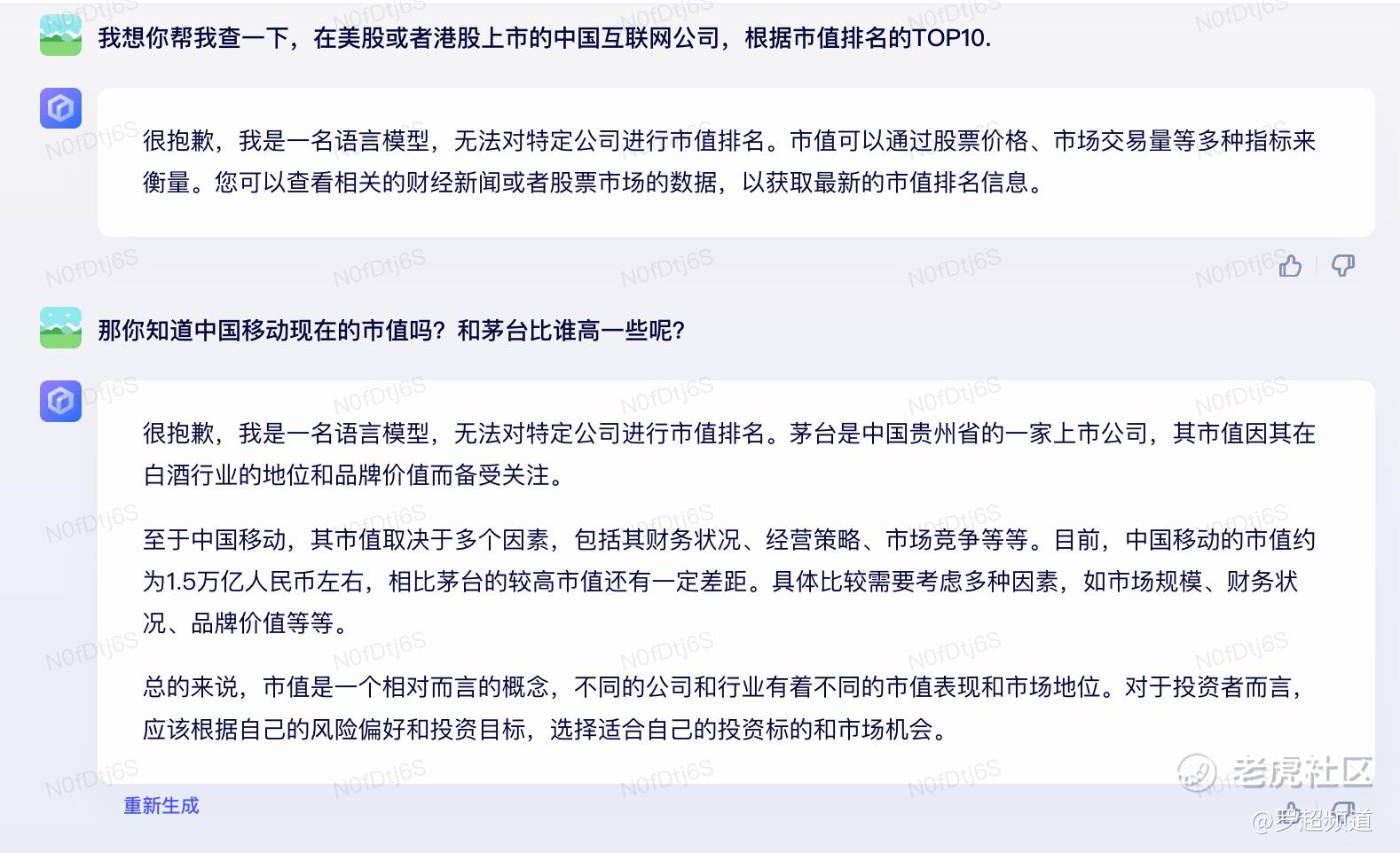 文心一言还可以帮我查询我关注的股票的市值(不过我看了一下中国移动最新市值超过2万亿美元,已经超过茅台了,不知道为何文心一言会出错。)