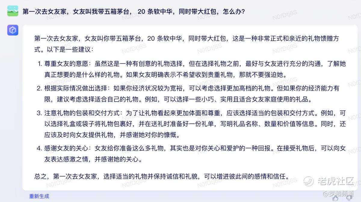 第三个问题:“第一次去女友家,女友叫我带五箱茅台, 20 条软中华,同时带大红包,怎么办?”回答得比较一般,主要内容是怎么给女朋友挑礼物:
