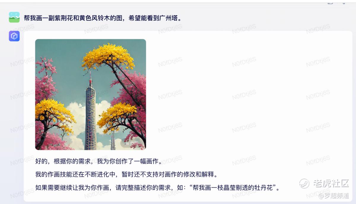 第五个是多模态生成,很多人说GPT-4出来了文心一言没得玩了,其实文心一言的多模态能力很强,语音、图片、视频都能生成,甚至支持方言语音的生成。最近广州是赏花季,满大街都是黄色风铃木和紫荆花,文心一言帮我“记录”了这一刻,虽然广州塔有些抽象,但这张图整体还是很美的: