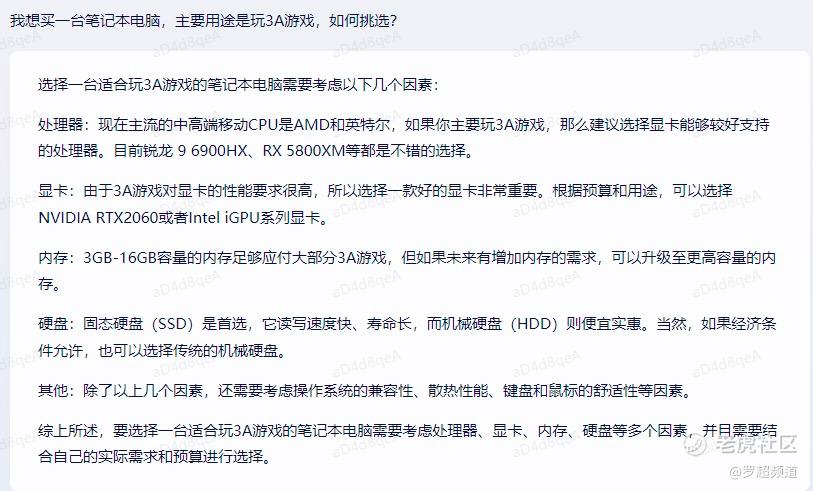 除了可以AI作画外,文心一言还可以给我们的编辑推荐玩3A游戏的笔记本电脑: