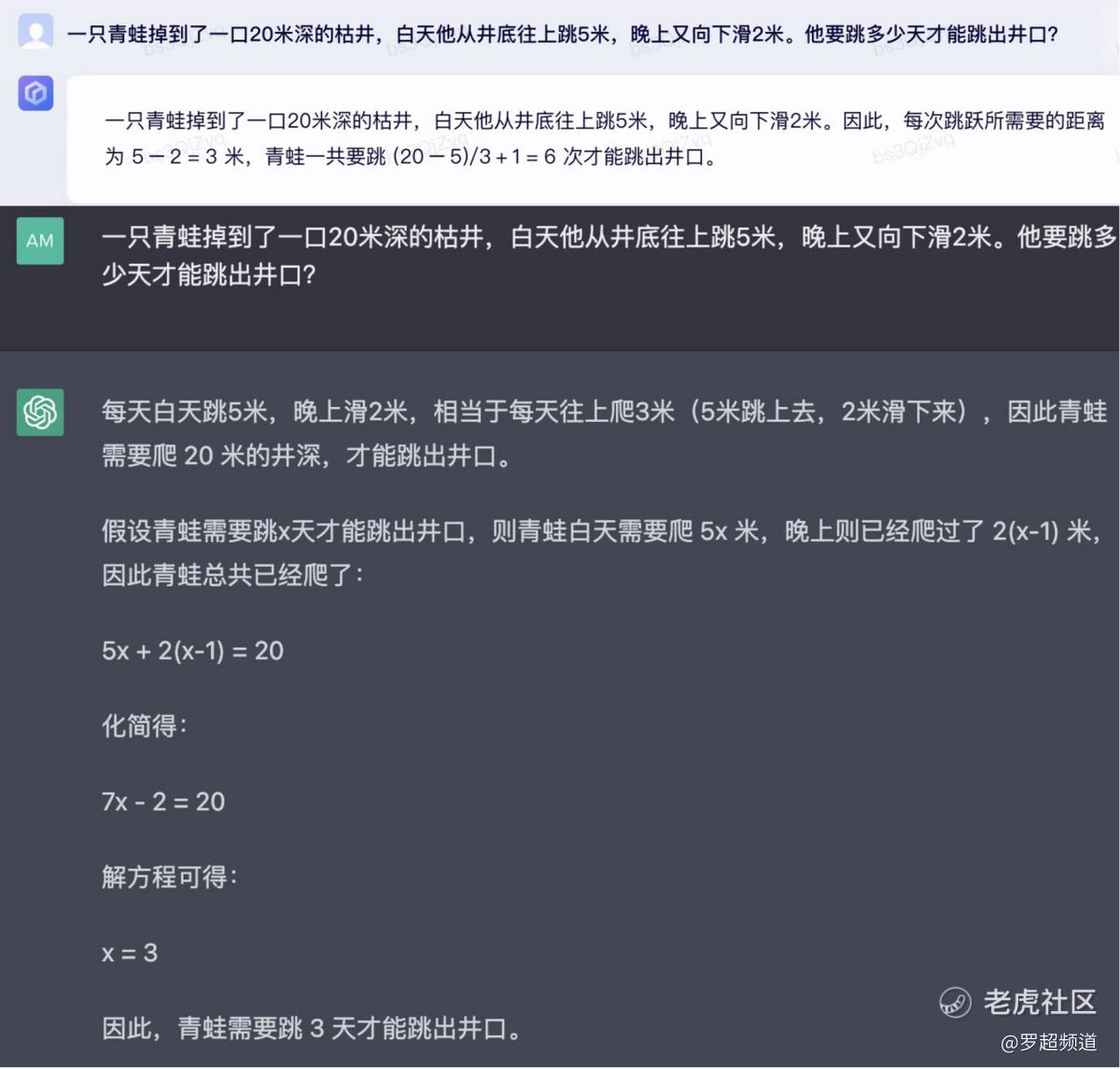 文心一言很多时候表现都比ChatGPT要聪明一些,比如回答青蛙跳水井、鸡兔同笼这样的问题时,表现都比ChatGPT好。