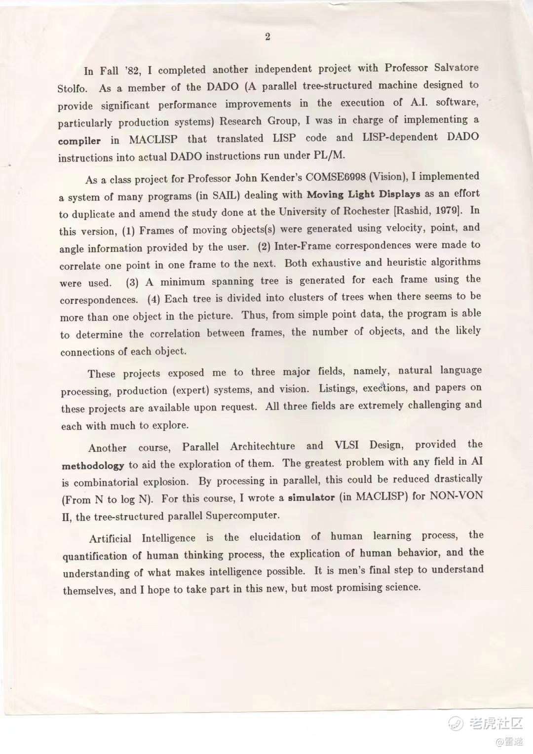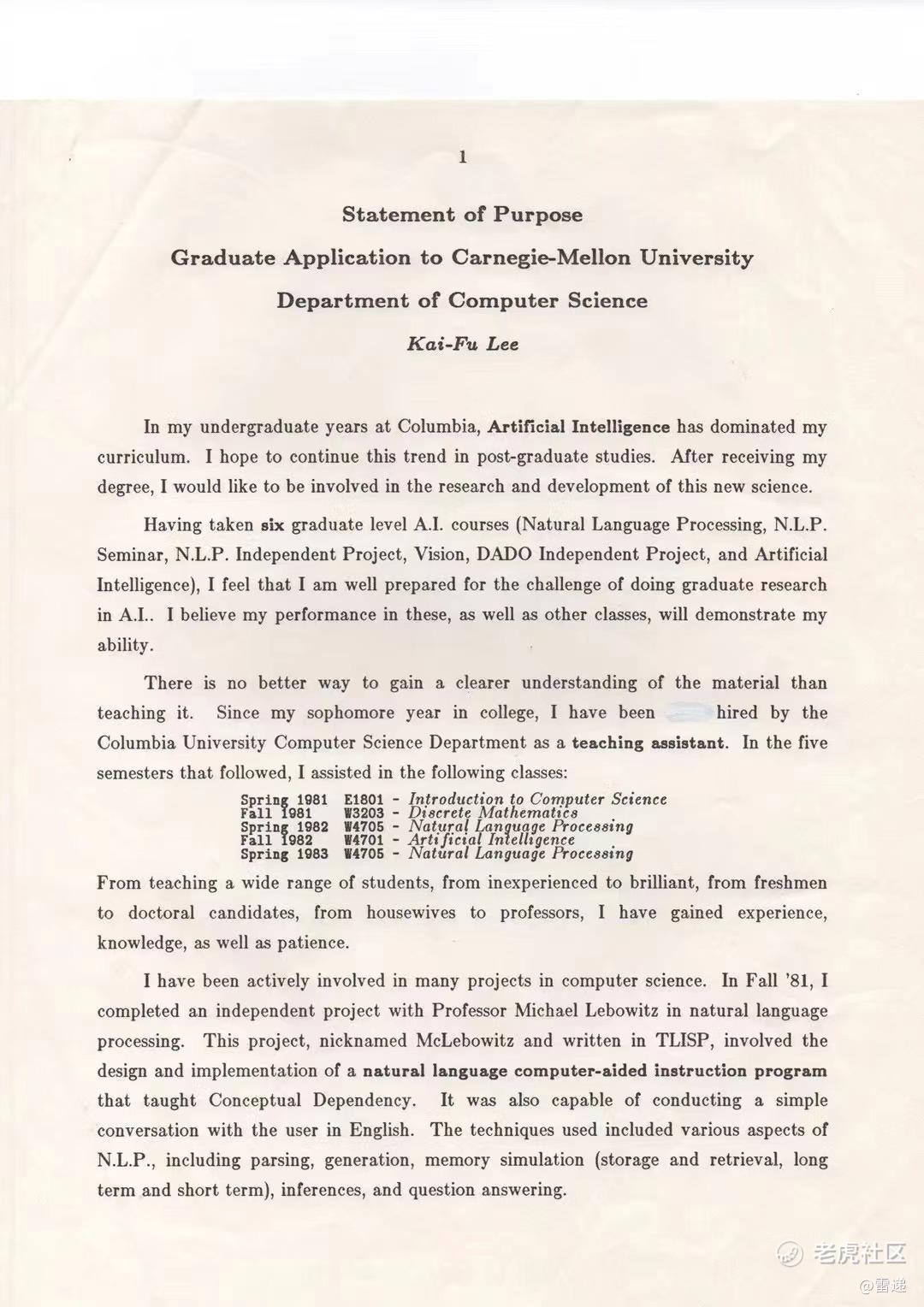 李开复还贴出了两张泛黄图片,来自李开复1983年提交CMU博士的申请信 — “AI 是对人类学习历程的阐释,对人类思维过程的量化,对人类行为的澄清,以及对人类智能的理解… AI是人类认识并理解自己的最后一里路,我希望加入到这个全新绽放、充满前景的未来科学领域”。