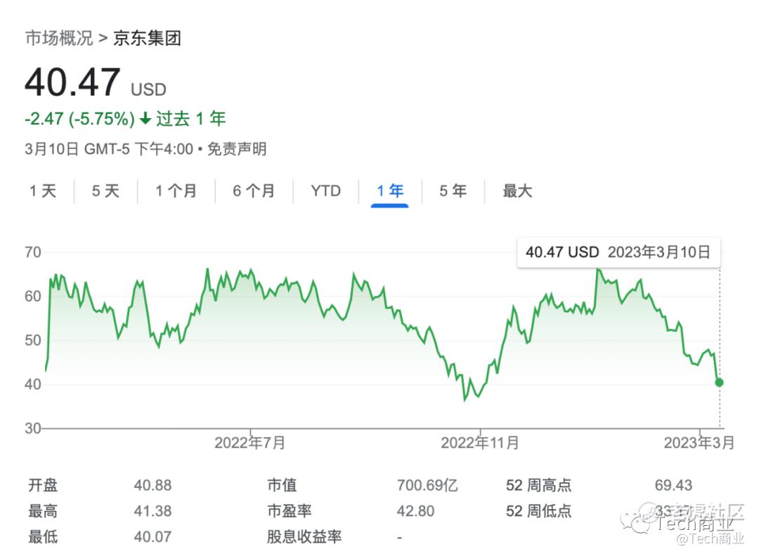 关于京东,该公司为消费者和客户提供电商平台服务和供应链技术等服务。京东2014年在美国纳斯达克上市,2020年在港交所上市。截至本文,过去一年该公司股价下跌5.8%,当前市值为701亿美元。