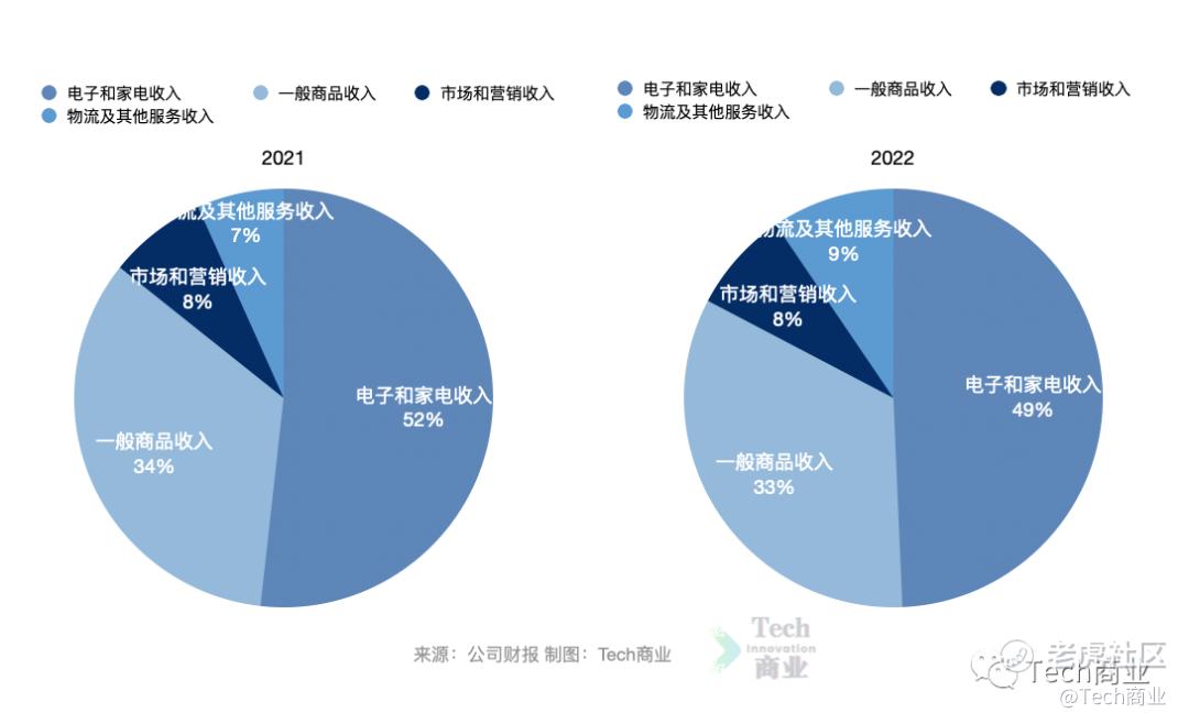 -本财年电子和家电收入占比为49%,一般商品收入占比为33%,2021财年两项产品收入分别占比为52%、34%,本财年均表现为占比下降。 -市场和营销收入本财年占比8%,与上一财年持平。物流及其他服务收入本财年占比为9%,高于上一财年收入占比。