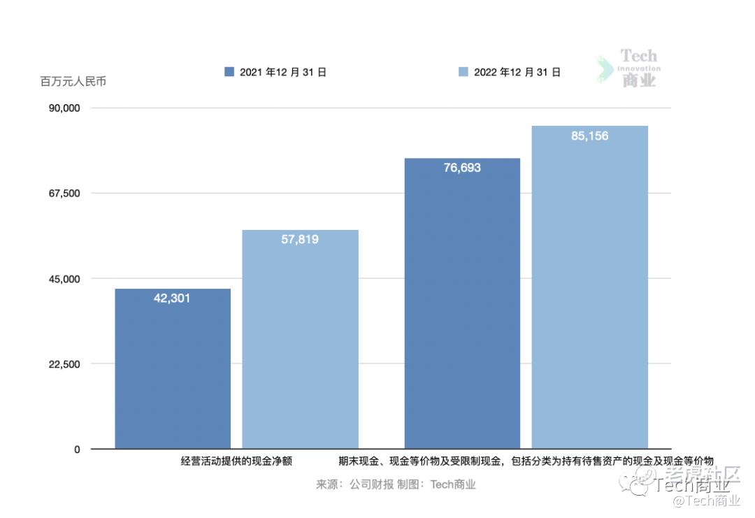 截至2022财年末,京东公司经营活动提供现金流578亿元,上一财年该项现金流流入423亿元,本财年有所增加。京东期末现金、现金等价物及受限现金(包括分类为持有待售资产的现金及现金等价物)为852亿元,上一财年该项为767亿元。
