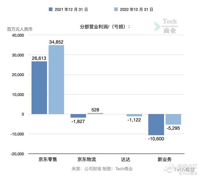 本财年京东零售营业利润349亿元,相较上一财年同期利润的266亿元,本财年有所增长。京东物流本财年营业利润为5.3亿元,上一财年为亏损18.3亿元,本财年扭亏为盈。达达业务亏损11亿元,新业务亏损53亿元。
