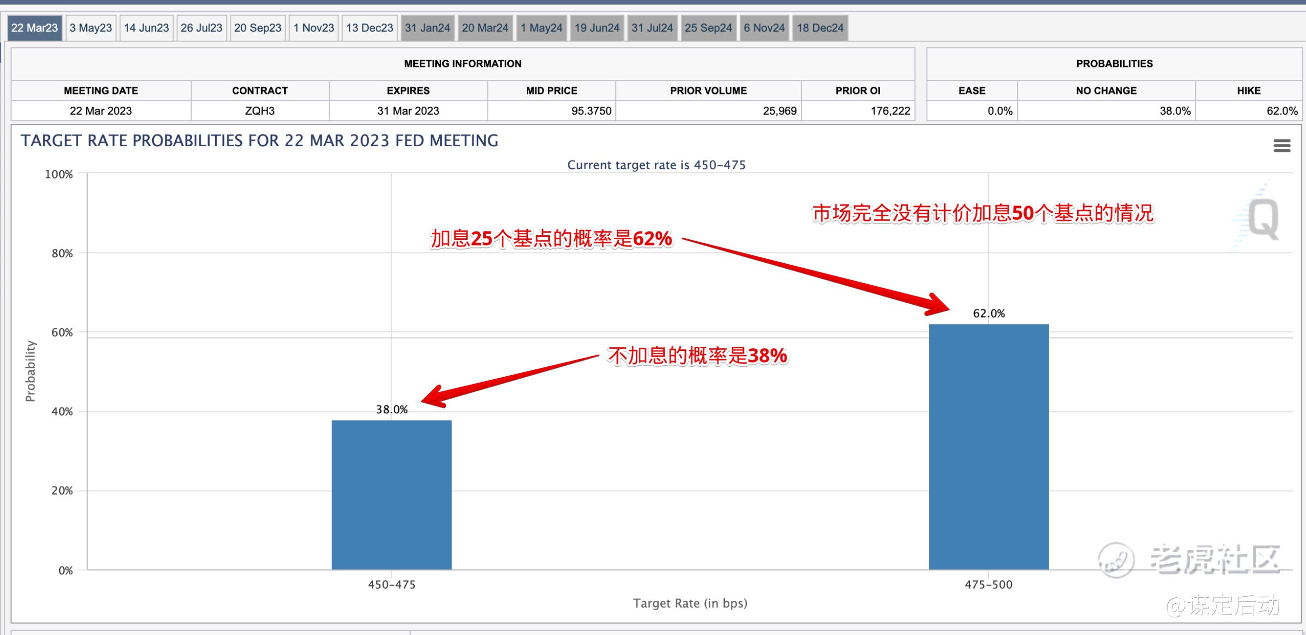 目前市场的计价是下周加息25个基点的概率是62%,不加息的概率是38%,而完全没有计价加息50个基点的情况。