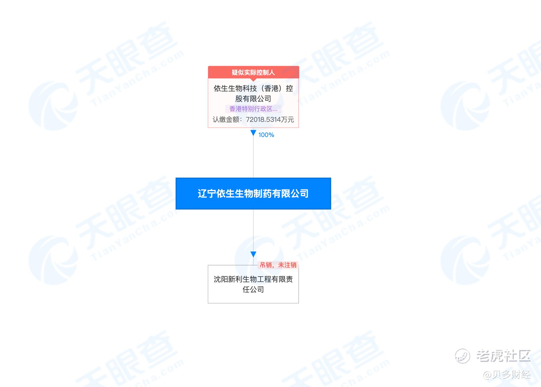 天眼查信息显示,依生生物成立于1994年,位于辽宁省沈阳市,全称为辽宁依生生物制药有限公司。目前,该公司的注册资本为7.20亿元,法定代表人为张译,由依生生物科技(香港)控股有限公司全资控股。