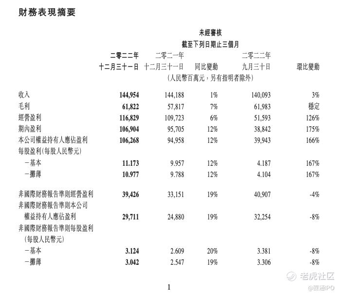 按国际财务报告准则,腾讯2022年Q4经营盈利为1168亿元,同比增长6%,经营利润率由去年同期的76%上升至81%;期内盈利为1069亿元,同比增长12%,净利润率由去年同期的66%上升至74%;期内公司权益持有人应占盈利为1063亿元,同比上升12%;每股基本盈利为11.173元,每股摊薄盈利为10.977元。