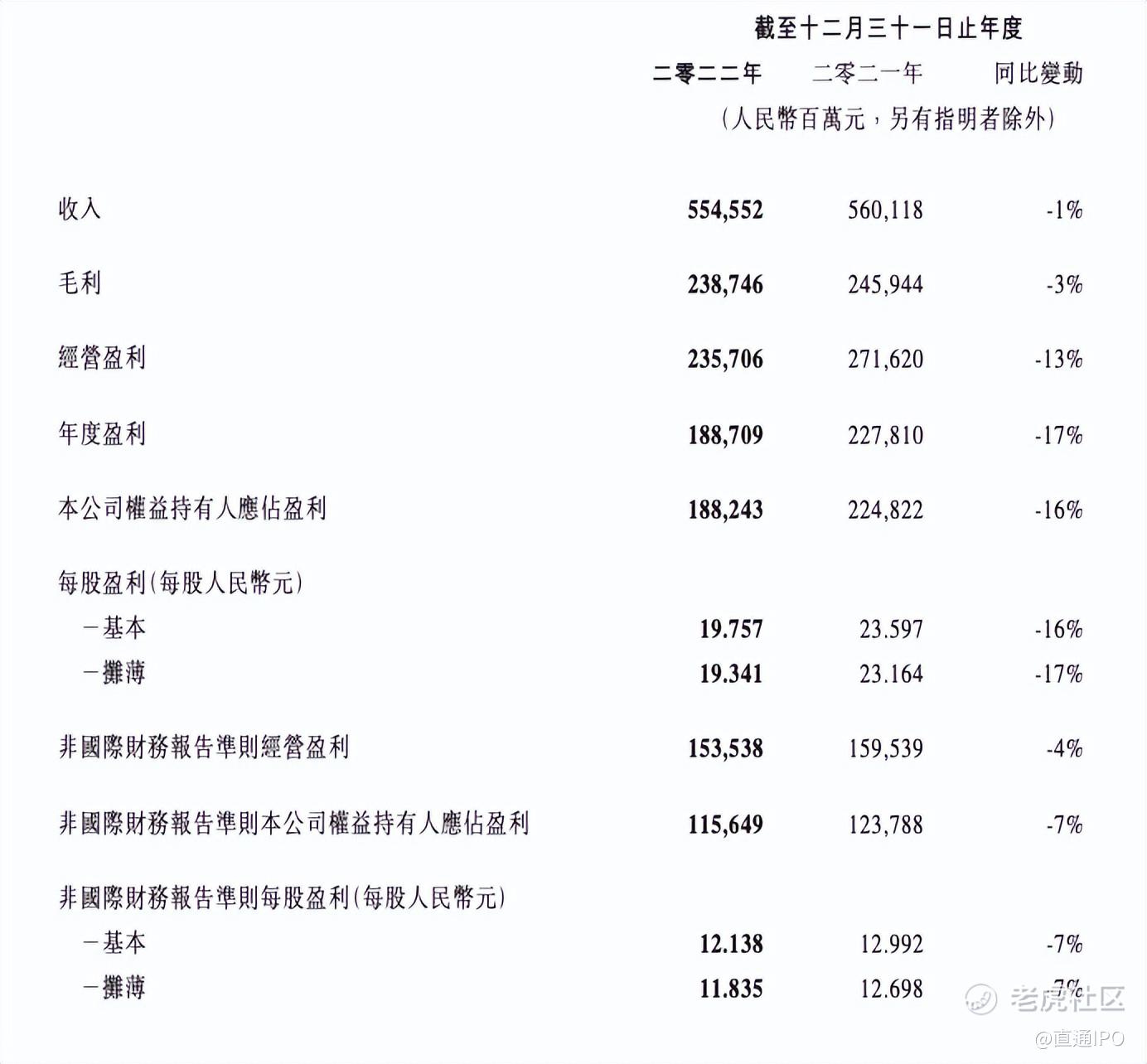 按国际财务报告准则,腾讯2022年经营盈利为2357亿元,同比下降13%,经营利润率由去年的48%下降至43%;年度盈利为1887亿元,同比下降17%,净利润率由去年的41%下降至34%;年度公司权益持有人应占盈利为1882亿元,同比下降16%;每股基本盈利为19.757元,每股摊薄盈利为19.341元。