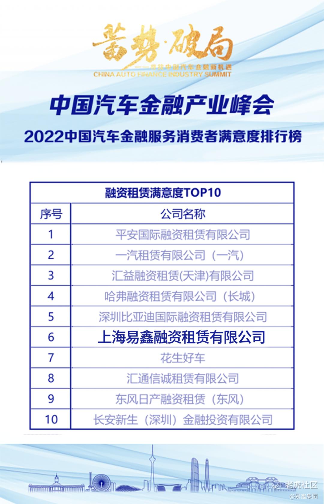 易鑫突出的业绩和服务能力也在本次峰会上得到了肯定。根据现场发布的《2022中国汽车金融服务消费者满意度排行榜》,易鑫集团第四度荣膺“融资租赁公司Top10”,显示出汽车消费者对于易鑫产品及服务的持续认可,验证了易鑫在第三方汽车金融平台中稳定的头部实力。