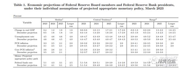 美联储在季度更新的经济预测中调整了今明两年的美国经济增速预期。对于2023年,GDP增长预期下调至0.4%(原预期为0.5%)。对于2024年,GDP增长预期下调至1.2%(原预期为1.6%)。同时,美联储进一步上调了同期核心通胀预测,2023年核心PCE通胀预期上调至3.6%(原为3.5%),2024年核心PCE通胀预期上调至2.6%(原为2.5%)。在失业率预测方面,美联储下调了2023年失业率预期至4.5%(原为4.6%),2024年失业率预期持平为4.6%,显示美联储对未来经济增长和通胀的担忧。