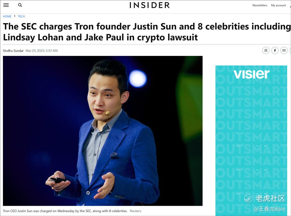 1.今天(3月23日),来自美国多家媒体的报道称,波场创始人孙宇晨(Justin Sun)及其三家公司,以及8名为其推广虚拟货币的名人,都遭到美国证券交易委员会(SEC)的起诉,指控他们如何出售加密代币Tronix和BitTorrent。