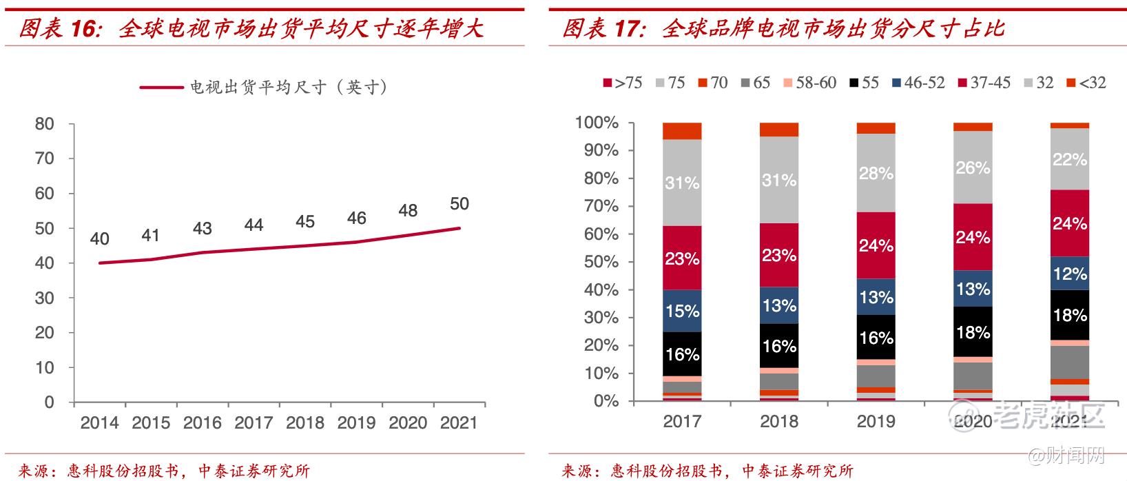 电视市场技术革新整体朝着大、轻、薄三个方向发展,特别是大尺寸化趋势是近年来电视市场的主旋律,2020 年全球电视平均尺寸增长 2 英寸,2021 年全球电视平均尺寸增长 1.9 英寸,面板大尺寸化仍是未来重要趋势,是推动面板需求增长的重要动力,电视平均尺寸的增长也可以进一步消化高世代面板产能。