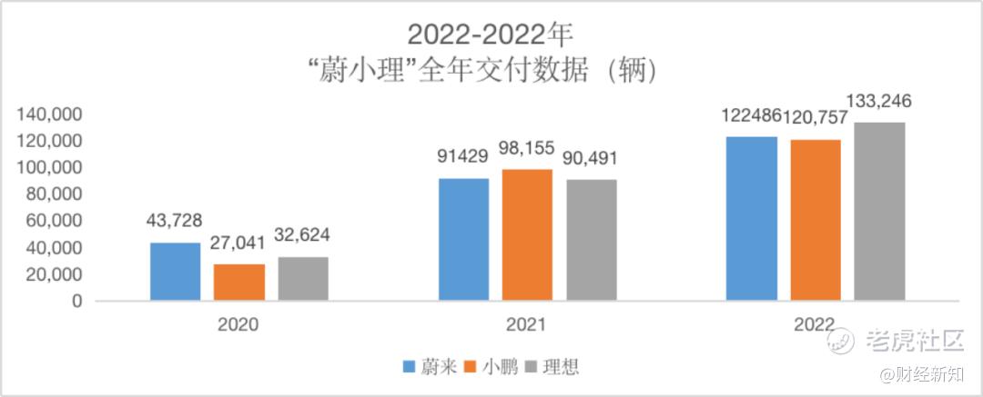 从2020-2022年全年交付数据来看,第一年,蔚来占了上风;第二年小鹏则更胜一筹;到了去年,理想则以超过13万辆的年交付,以及单月破2万辆的交付成绩进行了反超。而且,在过去的两个月里,理想的交付数据也超过了蔚来和小鹏。