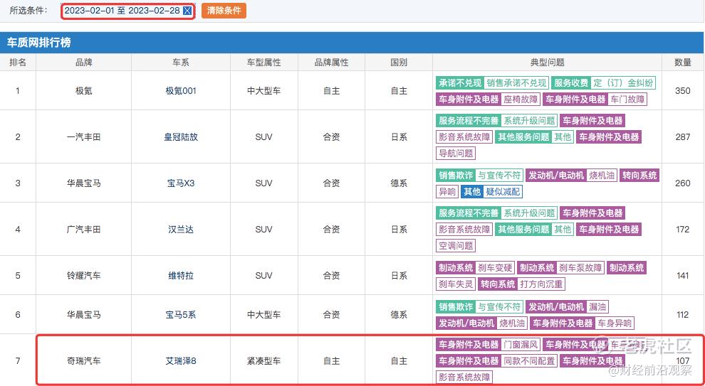 而且不知是否随着315临近,消费者试图最大化投诉效果,进入2月份之后,奇瑞旗下主要销量来源的一批车型,大都遭到了集中投诉。
