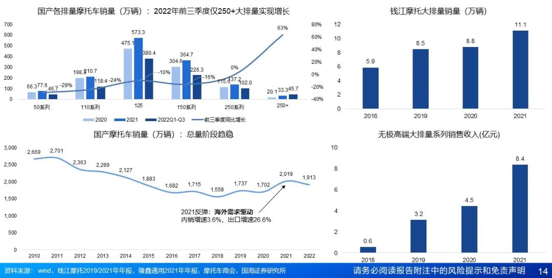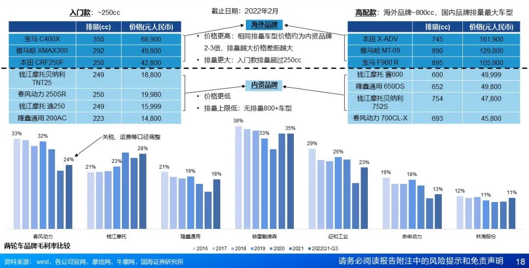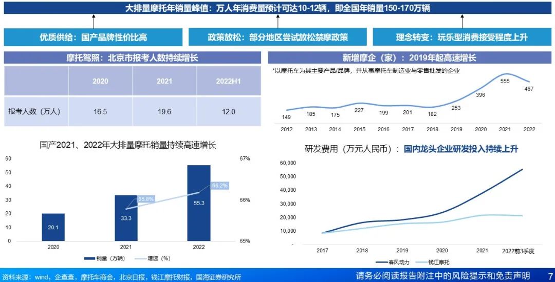 行业总量阶段趋稳,实用转玩乐。总量阶段趋稳:我国摩托车以通勤需求为主,受禁摩政策、电动两轮车与汽车替代影响,2016年开始,产销量趋于平稳。结构转换:伴随我国居民消费能力提升、理念转变,大排量摩托需求崛起,2022年国产大排量摩托销量达55.3万辆,同比增长66.2%。对标海外国家和地区,大排量摩托车峰值年销量超过10辆/万人,预计我国未来大排量摩托车年销量可达150万辆以上,成长空间大。国内大排量摩托市场持续扩容,单车利润较高,是行业重点发展方向。