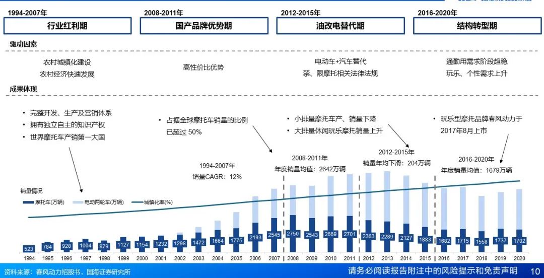 中国摩托车行业发展历程:城镇化推动行业发展,政策限摩驱动油转电,玩乐型需求正处成长期。1)上世纪90年代-2007年:行业红利期,1994-2007年CAGR达到12%,成为世界摩托车产销第一大国;2)2008-2011年:国产品牌优势期,年销量平均稳定于2642万辆,伴随城镇化建设与经济快速发展,我国摩托车行业设计、生产及营销体系逐步建立,占全球摩托销量比例超过 50%;3)2012-2015年:油改电替代期,销量平均每年下降204万辆,受禁摩令与油改电影响,摩托车销量持续下滑;4)2016-2020年:结构转型期,平均年销量1679万辆,总量阶段趋稳;伴随国内消费升级趋势,摩托车需求从实用转向休闲玩乐,大排量车型销量保持高速增长。