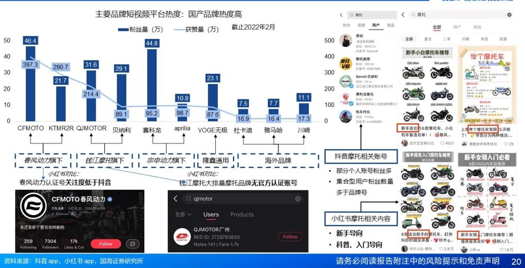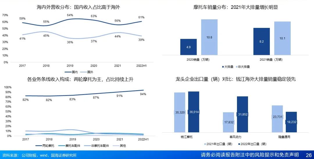中国大排量品牌崛起之路:国产制造实力+海外摩企合作。国内摩企以常规摩托起家,充分融合海外技术与设计,推出自有玩乐摩托品牌,以较高的性价比,借助短视频平台导流,贴合户外运动、社交、玩乐、个性表达等需求,实现了快速增长;国产头部摩企海外营收占比4-7成。对标海外企业,国产头部摩企在品牌形象、产品设计、技术研发、运营管理等方面快速进步,未来可期。