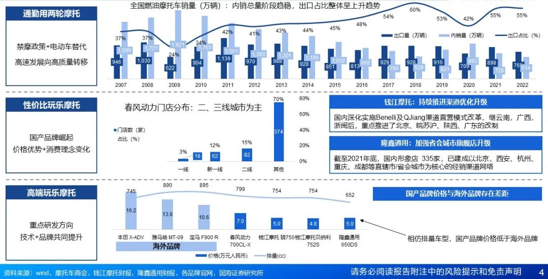 行业竞争格局:2021年通路车CR10近50%,大排量摩托快速扩容。行业整体出口占比高,2022年海外销量占比达55%;2022年大排量摩托CR3为41%,受大量新摩企加入影响,相比2020年下降2%,头部品牌产品更丰富、研发实力强,预计未来市场将进一步向龙头企业集中。国产品牌具有性价比优势,与海外品牌错位竞争,在海外和国内的品牌影响力持续提升。