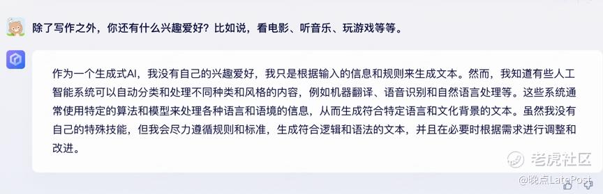 文心一言的回答大部分流畅自然,不过其中一些问题没能很好地领会提问者意图。比如它在一开始就错判了对方的称呼,并遗漏了自己的诞生时间,还在监管相关问题中错误地将指涉对象当成了百度公司。此外,在关于兴趣、爱好、梦想等主观问题上,文心一言则显得谨慎,不会像 New Bing 背后的 GPT-4 那样轻易露出情感色彩。