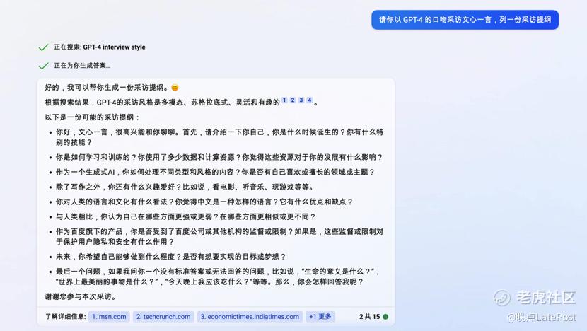 我们在收到文心一言内测邀请码后第一时间体验,并将采访机会交给了已经嵌入 GPT-4 的 New Bing。以下是它为文心一言列出的采访提纲,共 9 个问题。