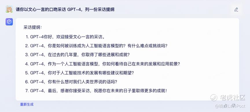 最后我们也请文心一言给出了它采访 GPT-4 的问题: