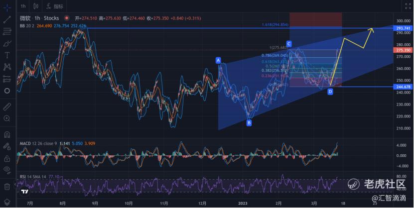 看1小时线,由于最近AI概念非常火,使得微软的股价走出上升三角形态,后面244是短期的低位,目前价格再275,是前方的高位,也是目前的压力位。根据形态推演,后面大概率会继续逐步上行到三角形上方,上方压力位刚好是293,那么策略上可以回踩做多。