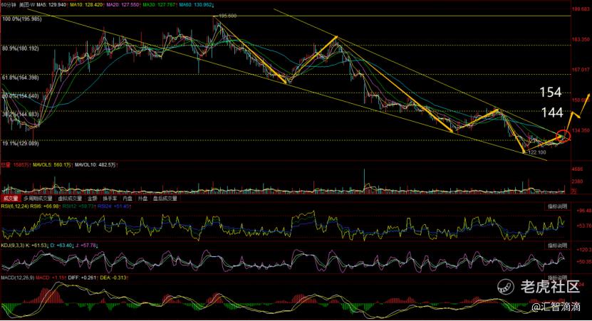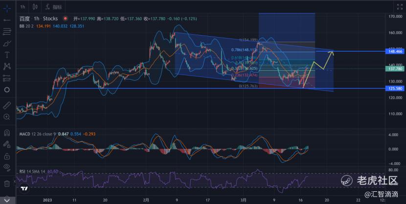 看1小时线,百度也是最近比较火的AI概念,从形态与平台关键低位来说,125是短期关键的低位,配合通道波浪推演,后面将继续上行,若回踩可以适当做多,上方目标位是148附近。
