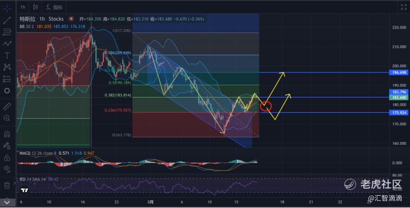 看1小时线,昨天已经再次在175守住,则后面大概率要震荡上行或调整后再上行。第一种推演,短期我们要确认一个的支撑位,大概在175与183之间,确认支撑后并继续突破183,则可以继续做多。另一种则是回踩甚至跌破175,在下方获得支撑后,再走一波震荡调整后,再上行。