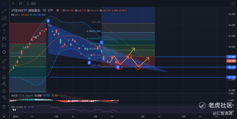 看1小时线,继续沿着昨天的分析,我们在等待一个D点,前面给出后面最低可能到28.1,不过看最近亚洲盘的走势,也可能在当前位置直接反弹到29附近。若反弹到29,那么后面关注能否继续突破,还是继续回踩,若回踩的话,根据形态推演,后面的回踩则是一次比较稳健的上车机会。