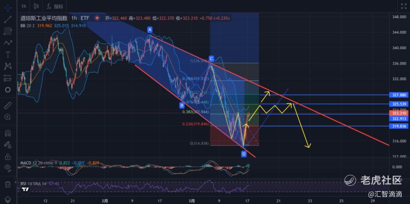看1小时线的走势,昨天已经分析过,短期D点是目前的低位,同时价格处于三角形态的反弹浪中。后面第一种推演,继续向上,看能否快速向上到达327,并走完三角形态。另一种推演,在323与325之间震荡,触碰上方趋势线后,则再选择突破离开三角形态还是继续回落。