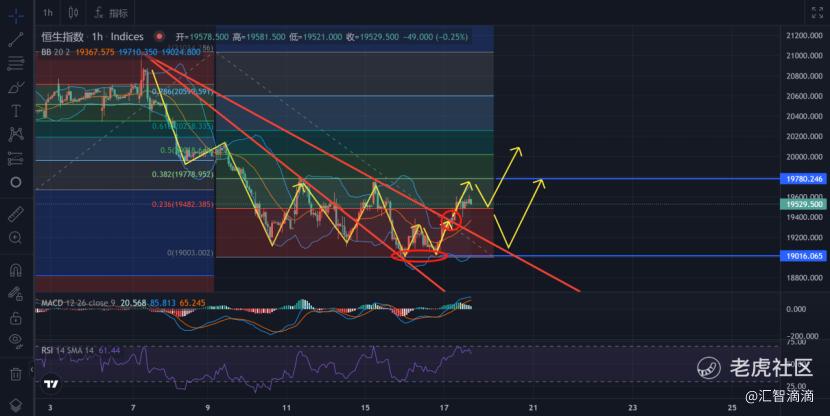 看1小时线,根据昨天的分析与今天亚洲盘的走势,我们可以确定2点,一是恒指短期在19000附近是确定的低点,二是已经突破了下降三角形态,将走出新的趋势与形态。那么后面若回踩的话,守住前方的低点,就是比较好的进场位置。