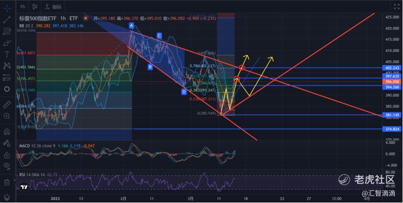 看1小时线,依然沿着昨天的推演,在三角形态内走着反弹浪,前面381是短期的低点。后面的推演,一种是走完反弹浪突破397与402压力位,并站上402上方,则三角形调整形态走完,将继续向上走出新的趋势。另一种是短期走势比较弱,价格被397压制着,回踩下来下方红色支撑线获得支撑后,再逐步向上到397并走出三角形态。