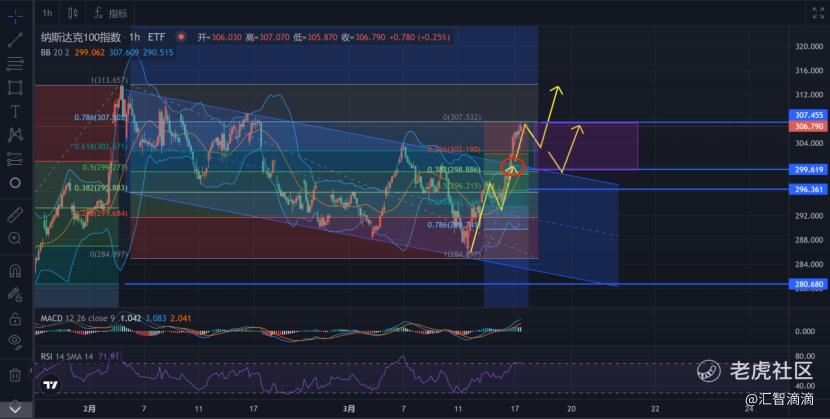 看1小时线,昨天突破的红色圈的位置,这里是下降趋势线的压力位,同时也是前面2月份回撤下来画出黄金分割线的0.618的重要位置,大概再299-300附近。根据昨天的推演,突破该位置后,下降通道已经走完,将进入新的趋势与形态,短期来看,后面若继续突破307,则有可能触碰前方高点,若回踩并在下方299守住,则在紫色区域震荡修整。