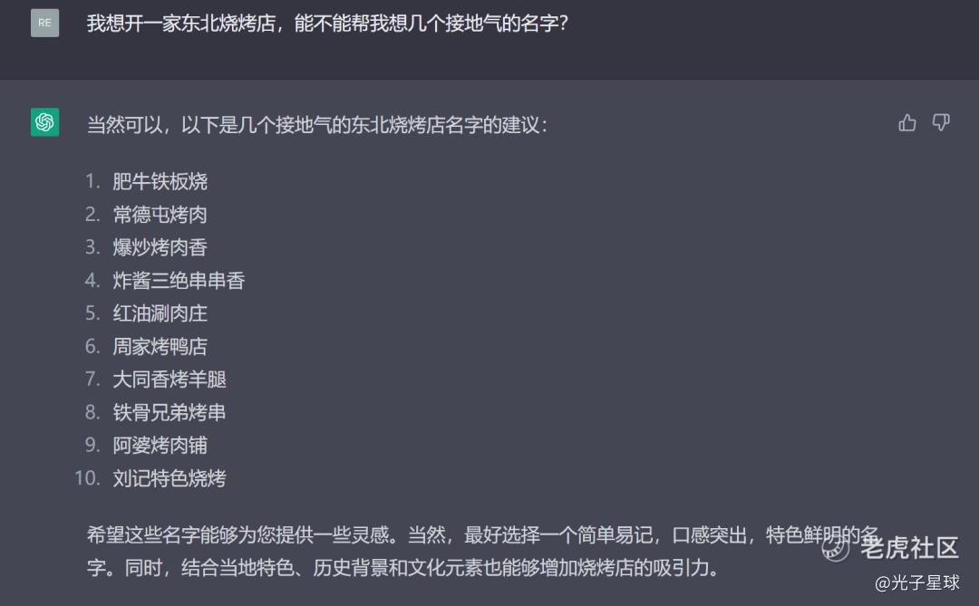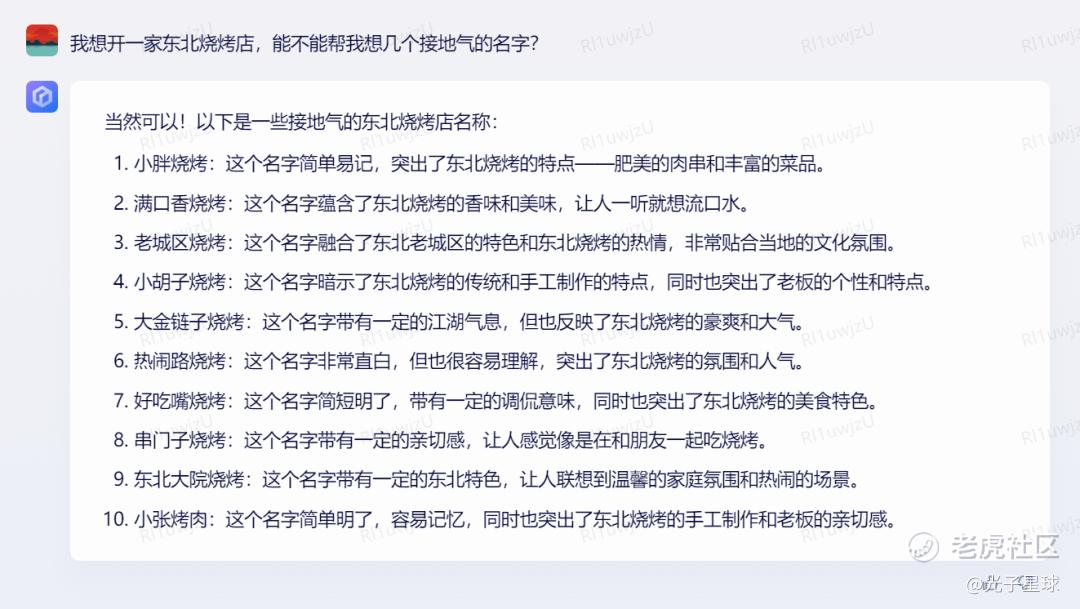 提问是东北烧烤,但ChatGPT的回答似乎有些驴头不对马嘴,将串串香、烤鸭等五湖四海的美食汇聚一堂。相比之下,文心一言的回答不仅到位许多,甚至还呈现出了不同答案的取名逻辑。