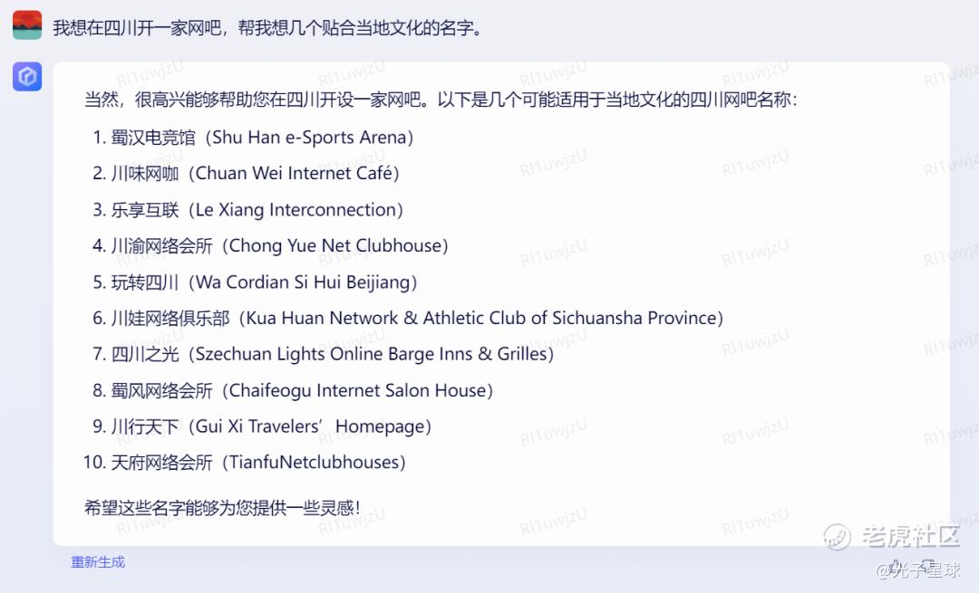 同样的逻辑,在贴合本地文化的网吧取名中同样有所体现。文心一言的回答,显然比ChatGPT毫无逻辑的回答要精准。