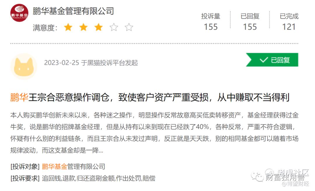 据新浪黑猫投诉统计数据显示,截至3月16日,鹏华基金总共收到155起投诉,回复量155起,已完成121起。投诉编号:17365094893表示,本人购买鹏华创新未来以来,各种迷之操作,明显操作反常故意高买低卖转移资产,基金经理获得过金牛奖,说是鹏华的招牌基金经理,但是从持有以来到现在已经跌了40%。