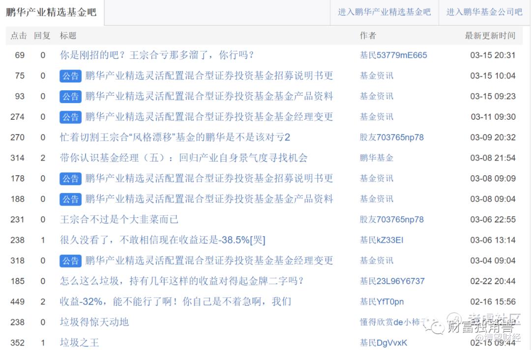 笔者在天天基金网贴吧里看到,有基民表示,基金经理考核不,这么差的业绩能发多少工资和奖金,王经理进来说说,基金公司也给大家公布一下。也有基民称,王宗合做啥我们不管,我们要的是本金.你基金公司别坑基民,快3年了,亏了多少,10个重仓股你亏6个不知道你怎么买的。