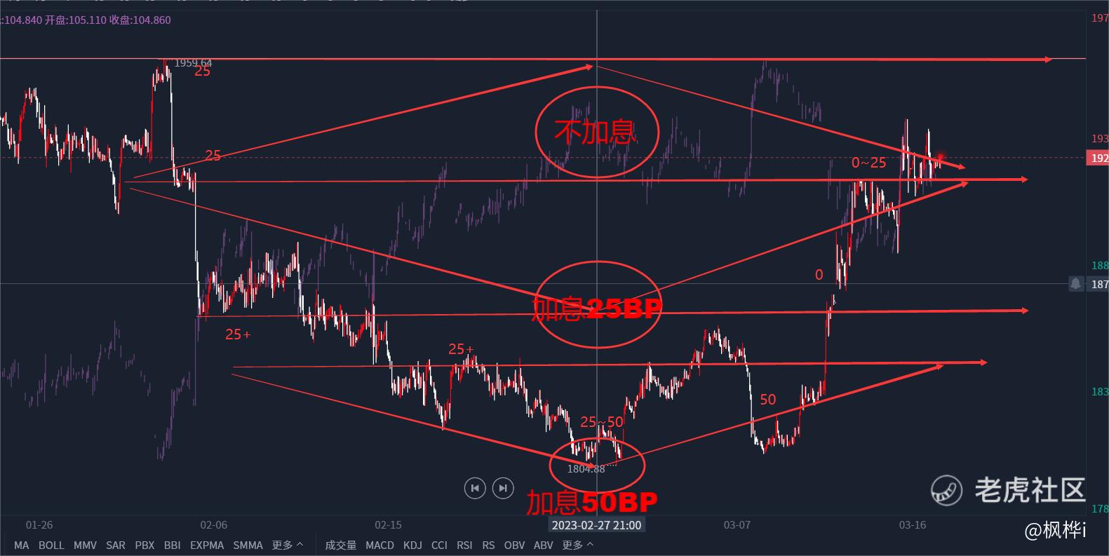 回到美联储的加息问题,2月到3月这维持两个月的加息周期对市场来说确实过的跌宕起伏,这其中从最高点的70%的概率加息50个基点,再到前几天的预期60%美联储在3月将停止加息,中间也只是过去了不到一周的时间,如此快的对于加息预期的转变也确实让市场有点措手不及,而至于美联储最后究竟加息几何,昨晚的欧央行利率决议也确实在一定程度上告诉了我们答案,这个我们一会再说,先来看一下与当前根据美联储加息幅度符合的黄金价格区间。