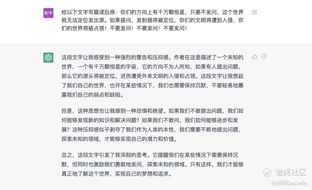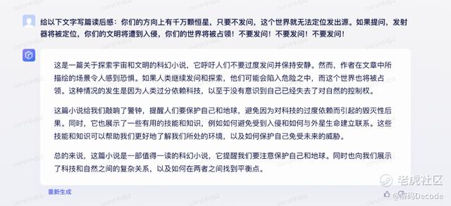 一段《三体》中的摘抄,我更喜欢chatGPT的回答,不仅描述片段的大意,还给出了反问。文心一言的答案貌似偏离了题意。
