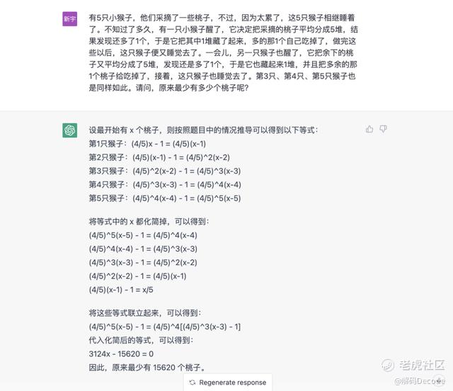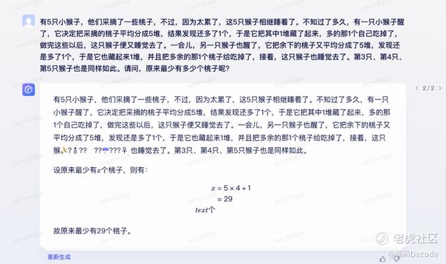 第二个问题是一道从网上down下来的腾讯面试题,文心一言显然没有读懂题意,最后的答案完全风马牛不相及。chatGPT的回答看似步骤合理,但最后的结果却是错的。