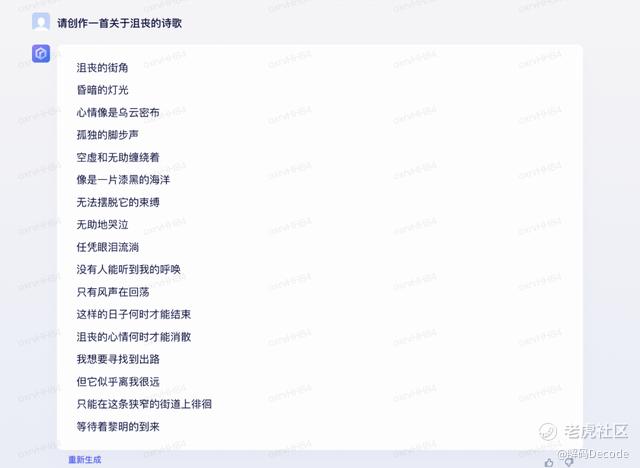 从用词上来看,文心一言和chatGPT开头的场景描写几乎一模一样。但整首诗的风格却不同,文心一言自始至终都是压抑的、悲观的,chatGPT却给了一个坚定且有希望的ending。
