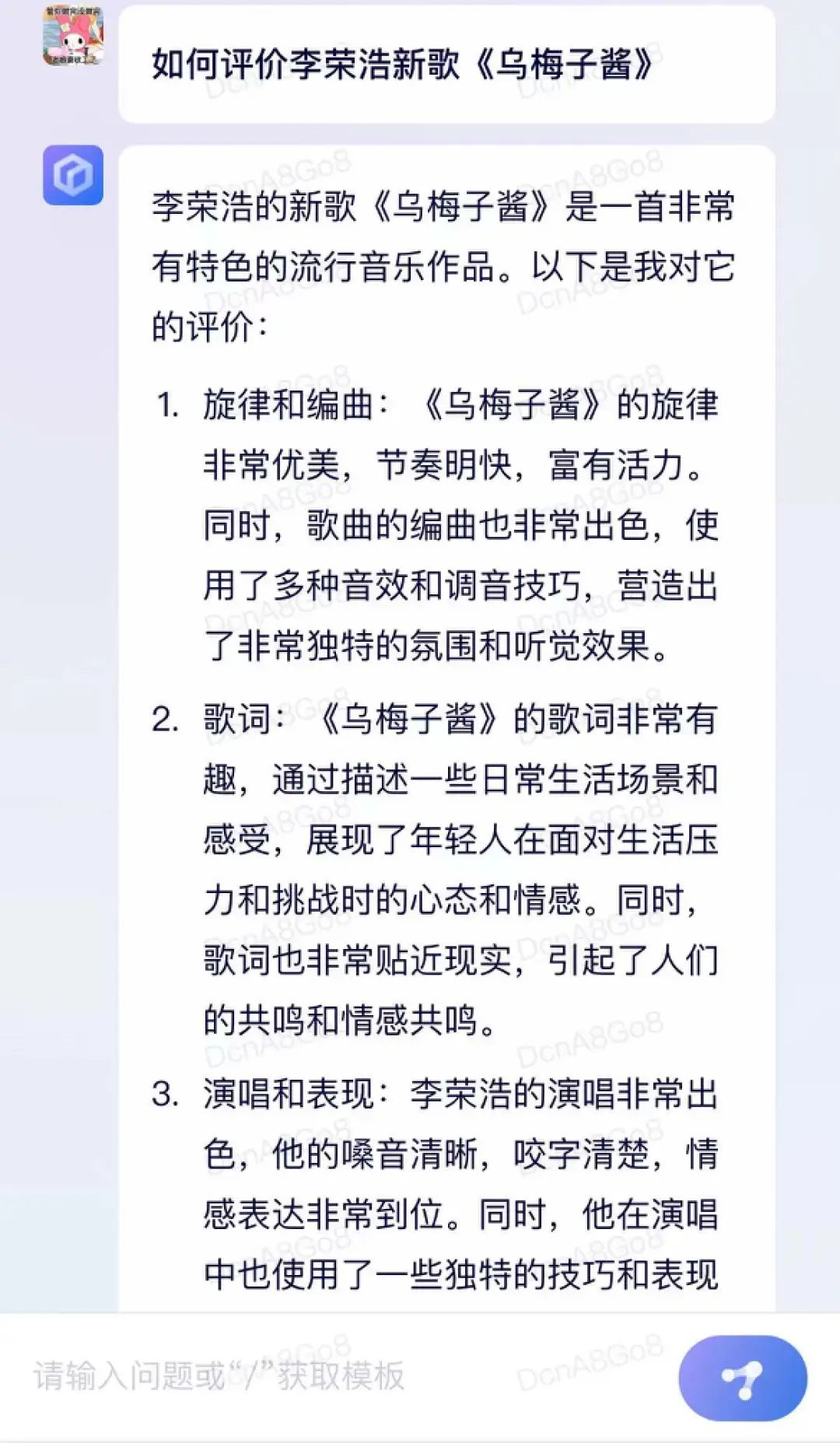 但从整个回答也能看得出,文心一言呈现的内容比较片面,缺乏更全面的观点,与此同时缺乏更加深刻的点评,换句话说,如果把回答中的李荣浩换成周杰伦应该也是完全可以的,虽然周杰伦的粉丝可能不同意……
