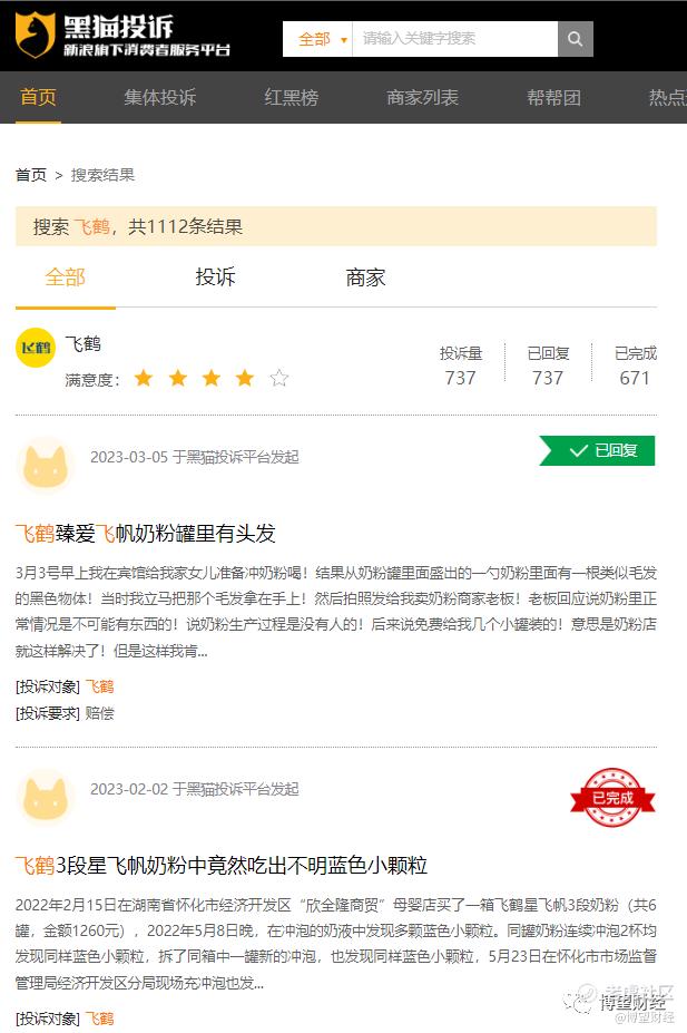 根据新浪旗下消费者服务平台黑猫投诉显示,截至3月14日,中国飞鹤投诉量高达700多条,多为奶粉里有虫、塑料、头发,吃出不明蓝色小颗粒,以及平台卖假货等。
