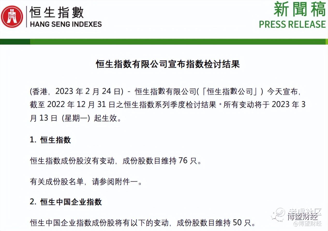 今年2月24日,恒生指数公司宣布截至2022年底的恒生指数系列季度检讨结果,显示恒生中国企业指数成份股剔除了中国飞鹤,取而代之的是小鹏汽车。值得一提的是,恒生指数成份股是反映香港股票市场整体表现的指标。上述变动已于2023年3月13日(周一)起生效。